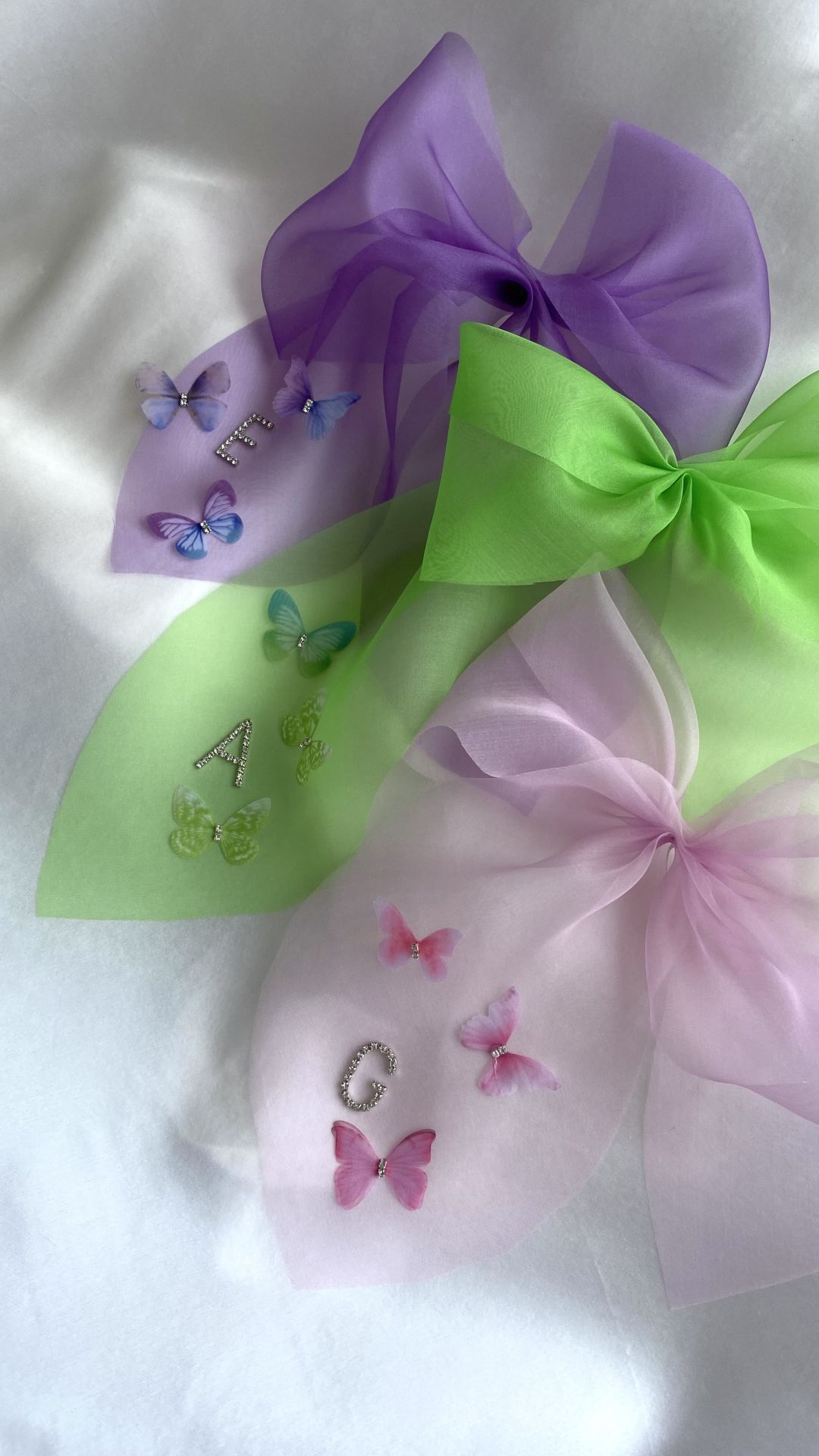 It was designed in our Istanbul Studio from 100% Silk Organza. Crystal stone rhodium monograms and organza dimensional butterflies were used. It has a French clip closure and allows easy use on all types of hair structures.