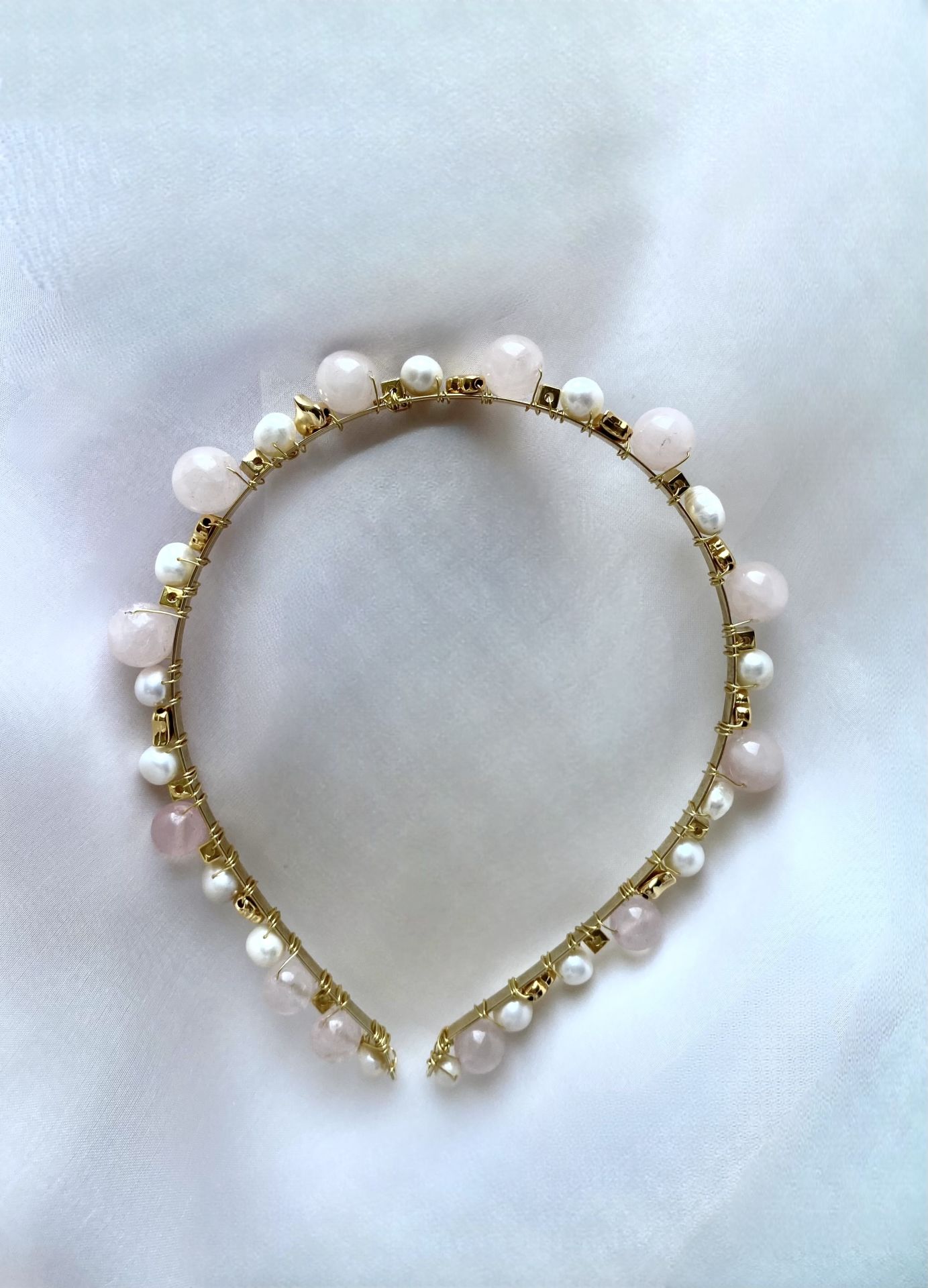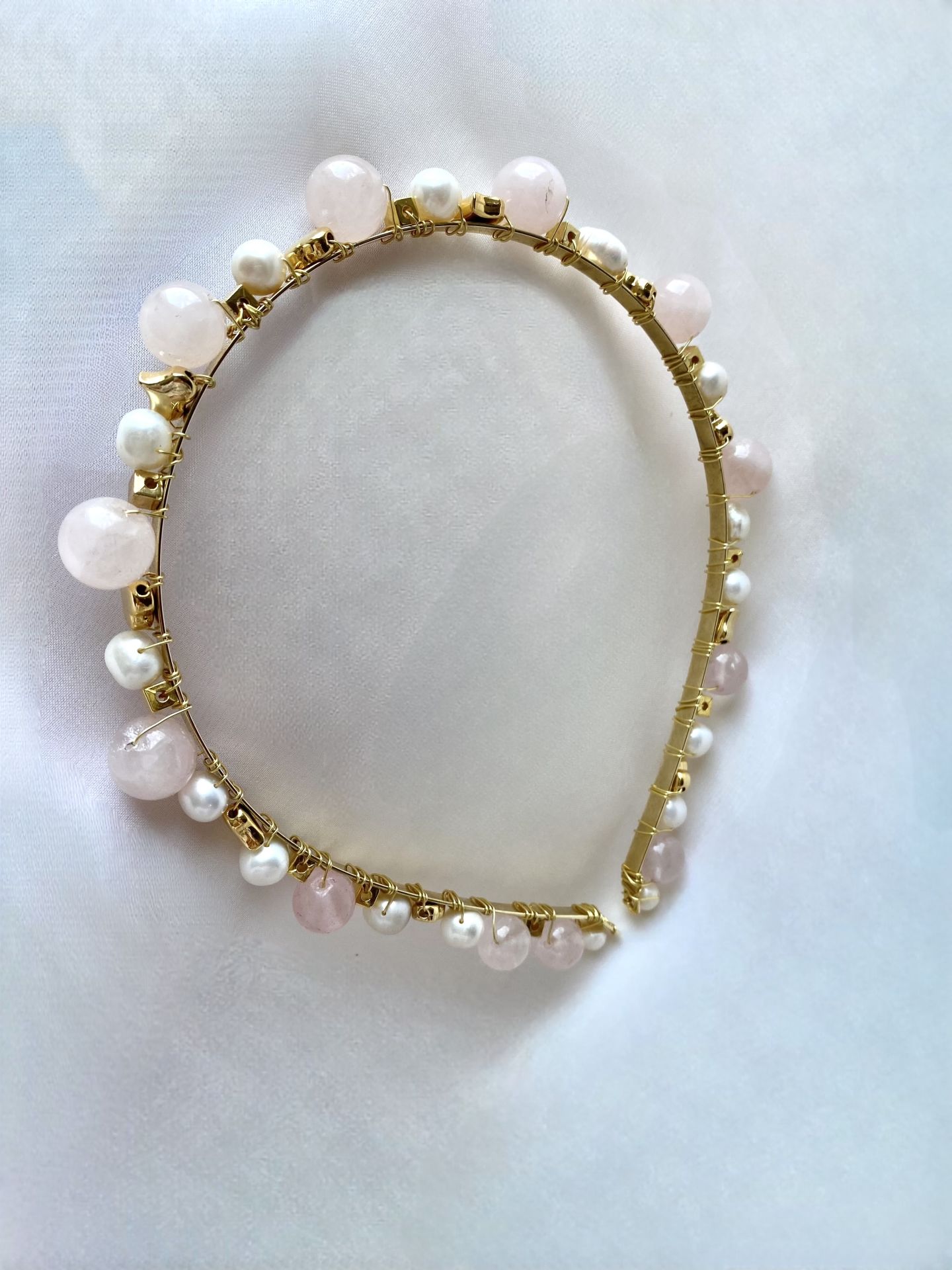 Doğal Rose kuvars taşlar , gerçek su incileri ve altın kaplama kalp aksesuarlarla tasarlanmıştır.